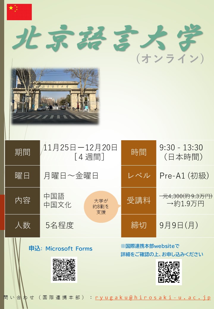 - 留学先機関(北京語言大学)でオンラインプログラム運営に必要な最小催行人数を確保できない場合は、弘前大学からの申込者がいたとしても中止となる可能性があります。