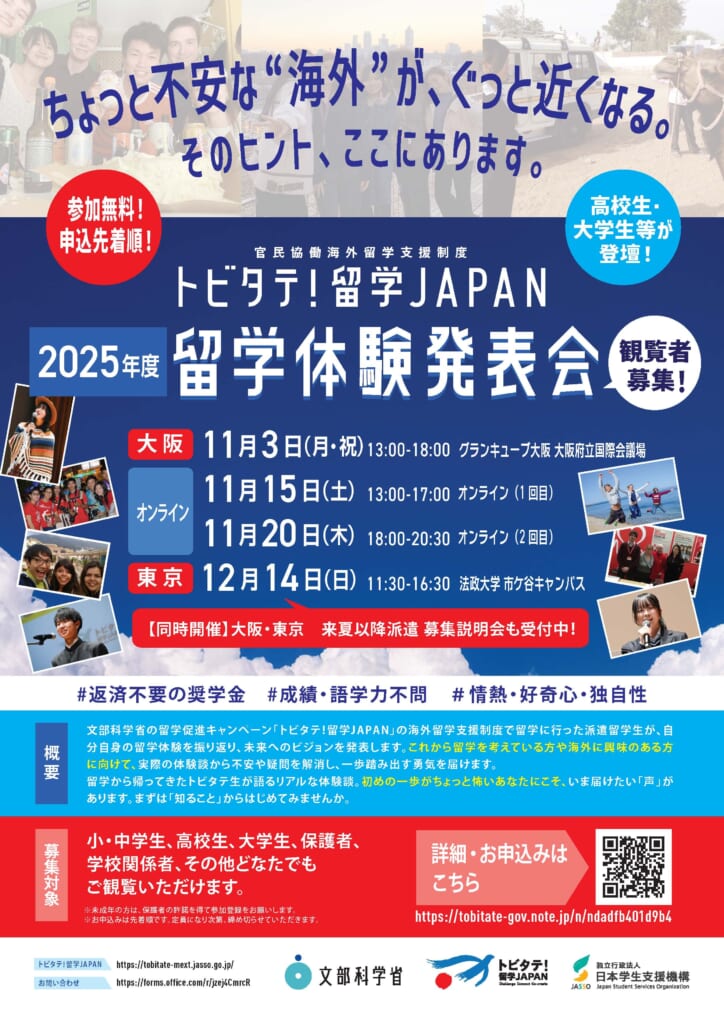 文部科学省 官民協働海外留学創出プロジェクトチーム主催「トビタテ!留学JAPAN 2025年度留学体験発表会」のご案内です。