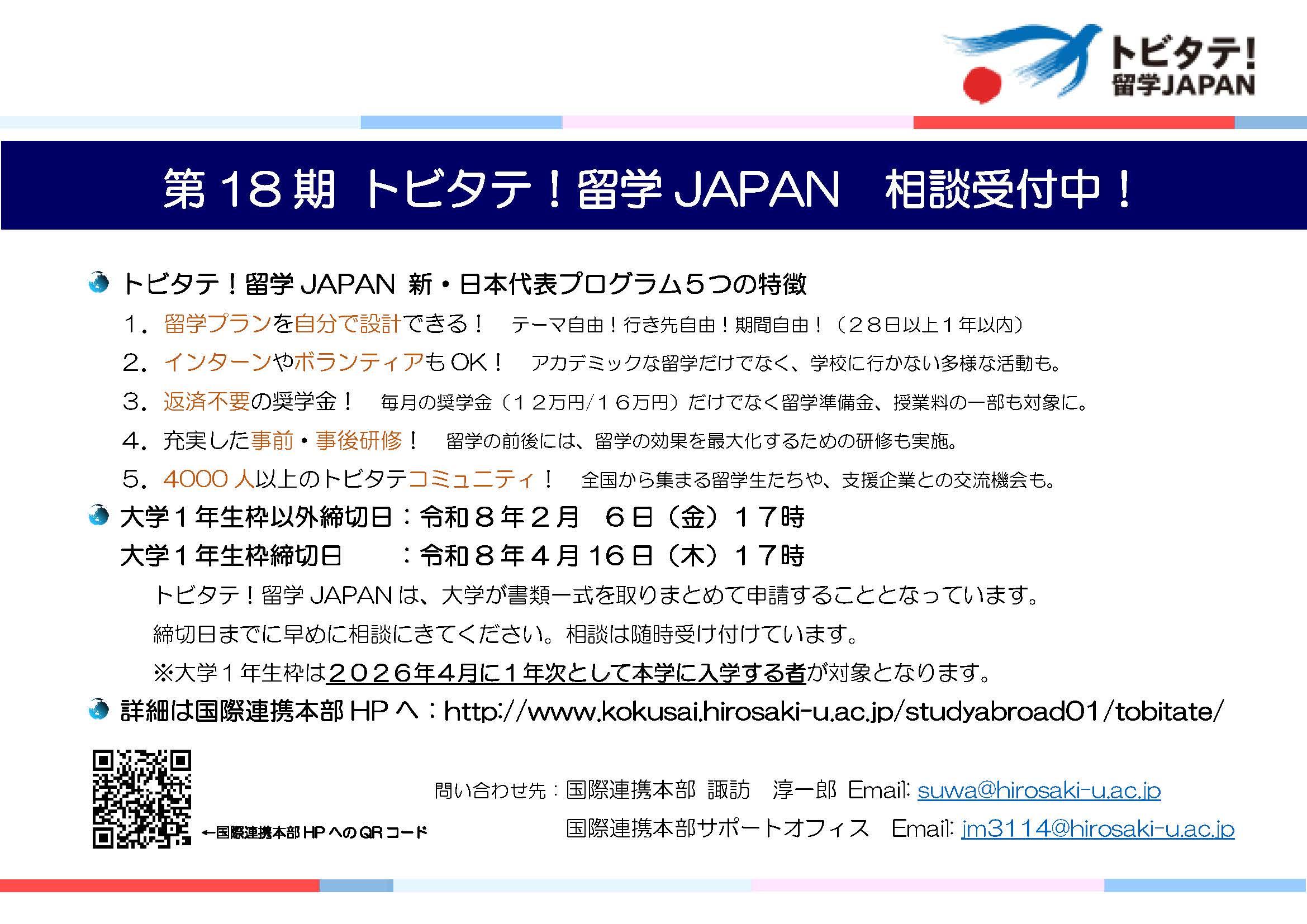 文部科学省官民協働海外留学創出プロジェクト「トビタテ!留学JAPAN」新・日本代表プログラム第18期の募集が開始となります。