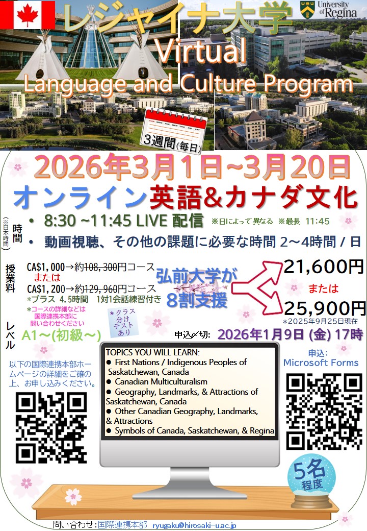 • 留学先機関(レジャイナ大学)でオンラインプログラム運営に必要な最小催行人数を確保できない場合は、弘前大学からの申込者がいたとしても中止となる可能性があります。