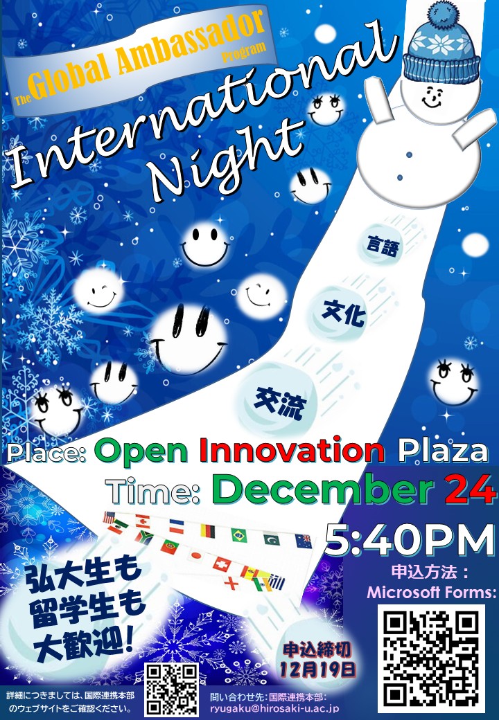 Hirosaki University is pleased to announce that on Wednesday, December 24, 2025, we will host the Global Ambassador Program 2025 – Part 1 Showcase: “International Night”
